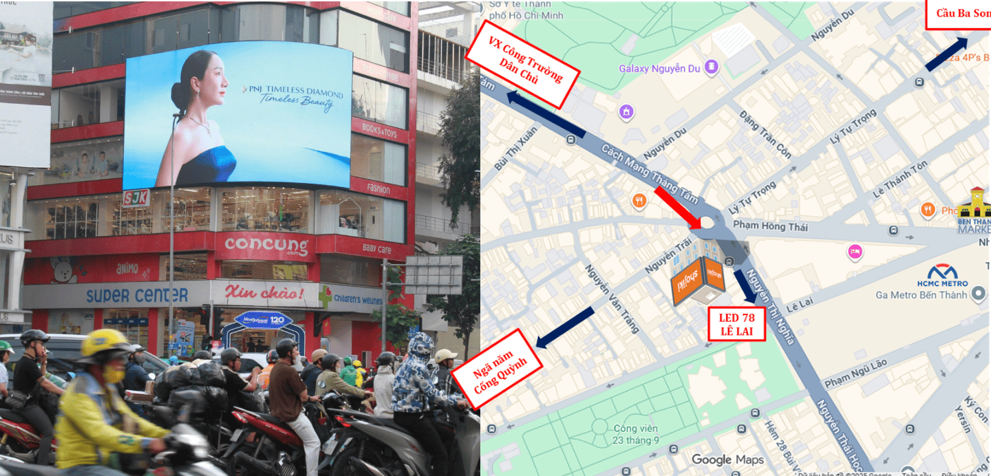 – Màn hình LED tại đây có 2 hướng nhìn: Hướng nhìn từ đường Phạm Hồng Thái và hướng nhìn từ đường Nguyễn Thị Nghĩa. – Khu vực đắc địa, gần khách sạn New World và trung tâm thương mại Zen Plaza, thu hút sự chú ý của 90% người tham gia giao thông. – Tệp khách hàng đa dạng, lưu lượng di chuyển luôn trong tình trạng tấp nập. – Có khoảng 202,401 lượt lưu thông qua lại mỗi ngày (theo Compass Tech) |